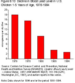 Average BLLs in children ages 1-5 years decreased from 15.0 to 2.7 micrograms per deciliter according to National Health and Nutrition Examination Surveys (NHANES) performed between 1976-1980 and 1991-1994 (Figure 8.10). However, there are still close to one million children in the United States who continue to have BLLs that are greater than or equal to 10 micrograms per deciliter, a level associated with adverse effects in children. Elevated BLLs among children most often results from residence in houses built prior to 1978 (when lead-based paint was banned) with chipping or peeling paint or with excessive amounts of lead-contaminated dust resulting from remodeling efforts. Other sources of lead exposure include soil contaminated by paint, residues from past emissions of leaded gasoline, and emissions from smelters, battery plants, and industrial facilities that process lead.