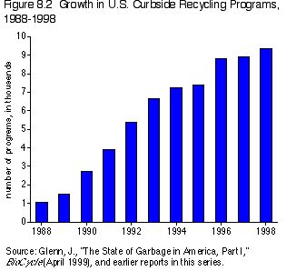 Much of the increase in material recovery is due to the growing number of curbside recycling programs and population served as well as the growing number of large-scale composting operations, facilities that pull recyclables out of mixed waste, and facilities that process recyclables. In the eleventh annual State of Garbage in America survey, BioCycle reported that 9,349 curbside recycling programs were operating throughout the United States and serving close to 139.5 million people (Figure 8.2). The survey also reported significant gains in programs that compost yard trimmings (Figure 8.3).