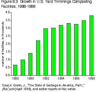 Over the last several decades, the MSW landscape has changed substantially (Figure 8.1). Gross solid waste generation has nearly tripled, from 88 million tons per year in 1960 to 220.2 million tons per year in 1998. Total per capita waste generation grew from 2.7 pounds per person per day in 1960 to 4.5 pounds per person per day in 1994, and then declined slightly in successive years. Waste generation would be even higher if not for waste prevention practices that keep materials out of the waste stream, such as backyard composting of yard waste and using mowers that leave grass clippings on the lawn. In 1998, Americans sent 27.7 million tons of yard trimmings into the waste stream, down from 35.0 million tons in 1990.