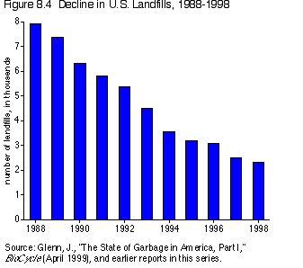 Discards remaining after recovery are either incinerated or landfilled. The importance of incineration for waste disposal declined over the 1960-1998 period from 30 percent of total generated waste to 17 percent. At present, 55 percent of generated waste is landfilled, down from 63 percent in 1960. Over the past ten years, the number of landfills operating in the United States declined (Figure 8.4) while average landfill size has increased.