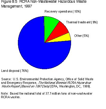 In 1997, there were 2,025 facilities permitted by RCRA to treat, store, or dispose of hazardous waste, up from 1,982 facilities in 1995. Using the wastewater exclusion, the total quantity of non-wastewater hazardous waste managed in 1997 was 37.7 million tons, an increase of 2.6 million tons, or 7 percent, since 1995. Land disposal accounted for 76 percent of the national non-wastewater management total (Figure 8.5). Deepwell or underground injection was preferred land disposal practice, accounting for 26 million tons of 1997 hazardous waste, followed by landfill disposal (1.5 million tons), surface impoundment (1 million tons), and land treatment, application, or farming (19 thousand tons).