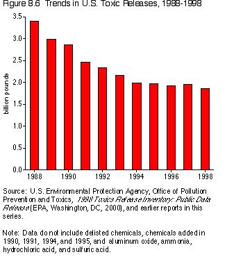 Total releases of toxic substances tracked by EPAs Toxics Release Inventory (TRI) have decreased from 3.40 billion pounds in 1988 to 1.86 billion pounds in 1998 (Figure 8.6). [Note: Because reporting requirements have changed, data for ammonia, hydrochloric acid, and sulfuric acid are not included in the 1988-1998 analyses. Reporting facilities added to TRI in 1998 are also not included.] On-site releases fell by more than half (51.9 percent), from 2.97 billion pounds in 1988 to 1.43 billion pounds in 1998. As shown in Figure 8.8, most of the overall reduction occurred in air emissions, a decrease of 1.26 billion pounds (from 2.18 billion pounds to 920.7 million pounds). This amounted to a 57.8 percent decrease in air emissions. The largest percentage reduction appeared in surface water discharges, which declined 72.9 percent (from 164.6 million pounds to 44.7 million pounds). For off-site releases, the overall trend in transfers to disposal over the 1988-1998 period showed almost no net change. From 1988 to 1995, these releases declined from 428.0 million pounds to 289.4 million, only to increase to 428.9 million pounds in 1998. This increase is partly due to a sharp increase in solidification/stabilization of metals from 1996 to 1997. Some of this increase, however, was offset by reductions in other types of off-site releases. Amounts sent to landfills and surface impoundments, the largest type of off-site release, decreased overall during the period, but increased in recent years.