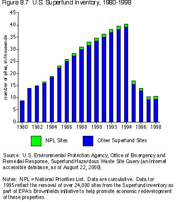 The EPA Superfund program was launched in 1980, with the passage of the Comprehensive Environmental Response, Compensation, and Liability Act (CERCLA), to protect human health and the environment from the dangers posed by abandoned or uncontrolled hazardous waste sites. The early years of the program were spent identifying and assessing sites, and cleaning up short-term emergency problems. By 1994, the number of sites in the Superfund inventory had grown to 1,360 National Priorities List (NPL) sites, the roster of the nations most serious hazardous sites, and to 39,099 non-NPL Superfund sites. EPA reduced the Superfund inventory in 1995 by moving over 24,000 low-priority, non-NPL Superfund sites to the Brownfields Program for cleanup and reuse. The non-NPL Superfund inventory was reduced further through cleanup removal actions to 9,404 in 1998. The NPL site inventory has been reduced also, dropping from a high of 1,374 in 1995 to 1,192 in 1998 (Figure 8.7). By the end of 1998, cleanup construction had been completed at 588 NPL sites since Superfunds inception.