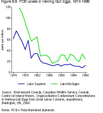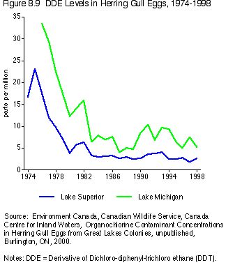 Long-lived toxic contaminants such as dichlorodiphenyl trichloroethane (DDT) and polychlorinated biphenyls (PCB) still persist in all segments of the environment, although in declining concentrations since their manufacture and use was banned or restricted. Concentrations of DDE (a derivative of DDT), PCBs, and other contaminants in eggs of herring gulls from colonies on the Great Lakes, for example, declined over period from 1974 to 1998. In Lake Superior, PCBs in herring gull eggs were measured at 76.24 parts per million (ppm) in 1975; by 1998, the level had dropped to 12.96 ppm. In Lake Michigan, PCBs concentrations show similar trends, declining from 118.42 ppm in 1976 to 24.61 ppm in 1998 (Figure 8.8). In both Lake Superior and Lake Michigan, DDE concentrations in herring gull eggs dropped sharply in the late 1970s and remained fairly stable in the 1980s and 1990s (Figure 8.9). Downward trends have been generally similar at other Great Lakes herring gull colonies and for other chemicals, including Dieldrin, Mirex, and HCB. (See also Fish Consumption Advisories in Chapter 6. Aquatic Resources.)